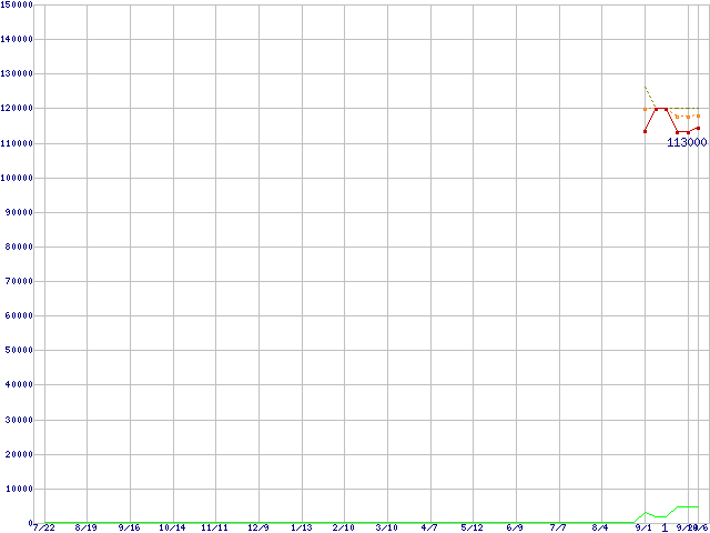 ※このグラフは過去のデータも税率5%相当に調整した税込み相当額のグラフです。 税率変更や、総額表示方式導入(2004年4月)の影響は除いています。 | | | ●凡例 | 最安値 (点線部は販売店未確認 または未調査) | 平均値 | 最高値 | ショップ数 |