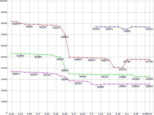 | Core Duo向けSocket 478 (FSB 667MHz,L2 2MB,Dual Core,VT対応)の最安値推移 | | | (2006年2月24日~2006年10月6日) |