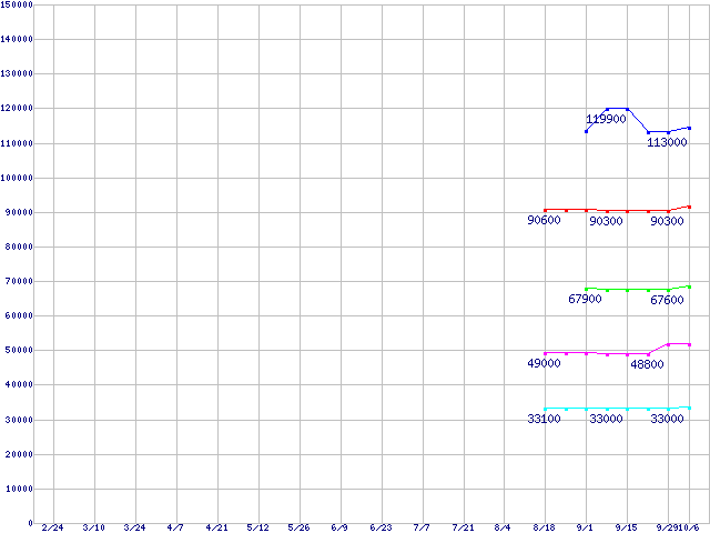 | Socket F (FSB 1000MHz,L2 1MBx2,Dual Core,TDP 95W)の最安値推移 | | | (2006年2月24日~2006年10月6日) |