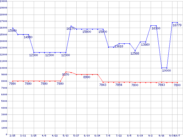 | PC3200(DDR400) DDR SDRAM DIMM ECC対応 Registeredタイプの最安値推移 | | | (2006年2月25日~2006年10月7日) |