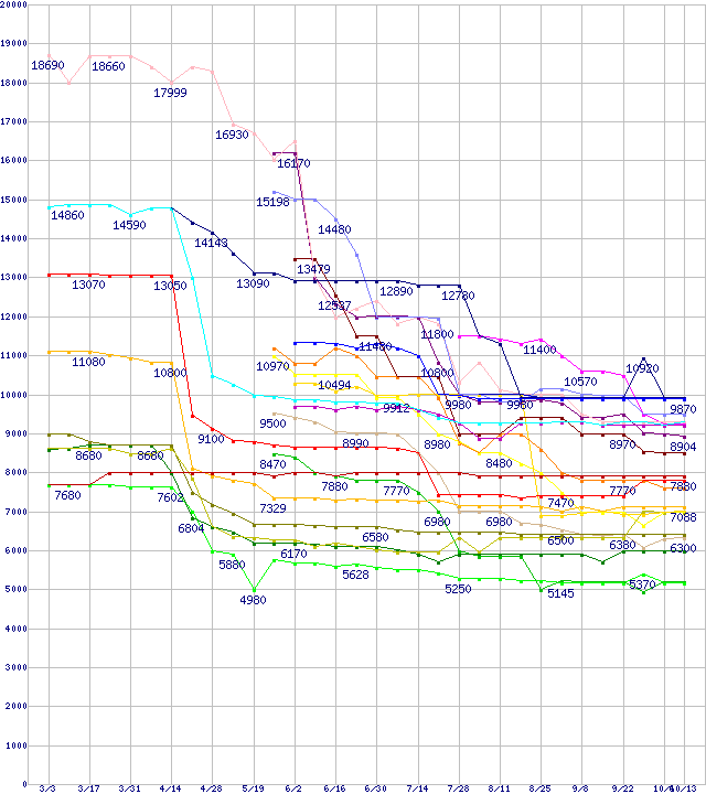 | CPU主要製品(最安値1万円未満)の最安値推移 | | | (2006年3月3日~2006年10月13日) |