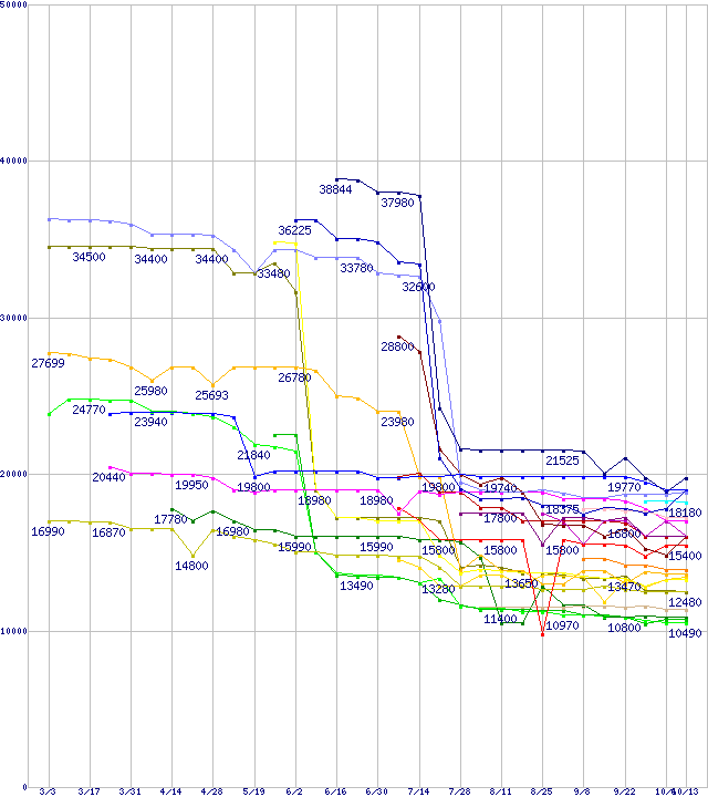 | CPU主要製品(最安値1万円~2万円未満)の最安値推移 | | | (2006年3月3日~2006年10月13日) |