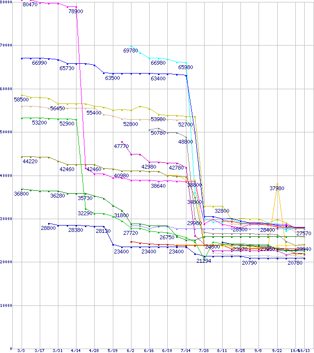 | CPU主要製品(最安値2万円~3万円未満)の最安値推移 | | | (2006年3月3日~2006年10月13日) |