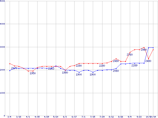 メモリ主要製品(最安値5千円未満)の最安値推移