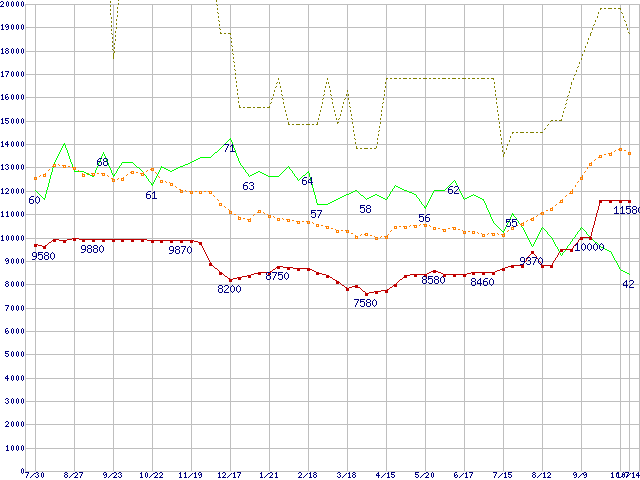 ※このグラフは過去のデータも税率5%相当に調整した税込み相当額のグラフです。 税率変更や、総額表示方式導入(2004年4月)の影響は除いています。 | | | ●凡例 | 最安値 (点線部は販売店未確認 または未調査) | 平均値 | 最高値 | ショップ数 |