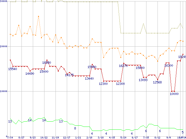 ※このグラフは過去のデータも税率5%相当に調整した税込み相当額のグラフです。 税率変更や、総額表示方式導入(2004年4月)の影響は除いています。 | | | ●凡例 | 最安値 (点線部は販売店未確認 または未調査) | 平均値 | 最高値 | ショップ数 |