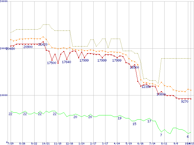 ※このグラフは過去のデータも税率5%相当に調整した税込み相当額のグラフです。 税率変更や、総額表示方式導入(2004年4月)の影響は除いています。 | | | ●凡例 | 最安値 (点線部は販売店未確認 または未調査) | 平均値 | 最高値 | ショップ数 |