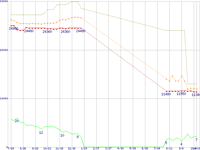 ※このグラフは過去のデータも税率5%相当に調整した税込み相当額のグラフです。 税率変更や、総額表示方式導入(2004年4月)の影響は除いています。 | | | ●凡例 | 最安値 (点線部は販売店未確認 または未調査) | 平均値 | 最高値 | ショップ数 |
