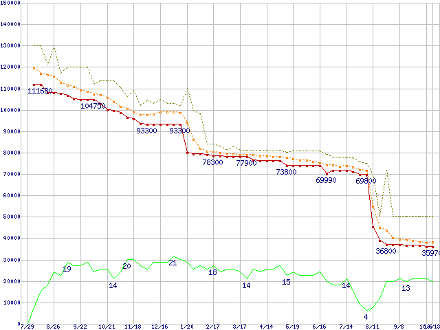 | Athlon 64 X2 4800+ (2.4GHz,L2 1MB×2,Socket 939)の価格推移 | | | (2005年7月29日~2006年10月13日) |