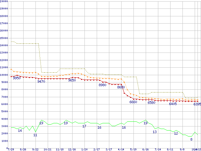 ※このグラフは過去のデータも税率5%相当に調整した税込み相当額のグラフです。 税率変更や、総額表示方式導入(2004年4月)の影響は除いています。 | | | ●凡例 | 最安値 (点線部は販売店未確認 または未調査) | 平均値 | 最高値 | ショップ数 |