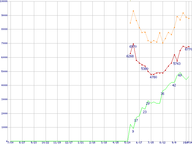 ※このグラフは過去のデータも税率5%相当に調整した税込み相当額のグラフです。 税率変更や、総額表示方式導入(2004年4月)の影響は除いています。 | | | ●凡例 | 最安値 (点線部は販売店未確認 または未調査) | 平均値 | 最高値 | ショップ数 |