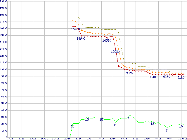 ※このグラフは過去のデータも税率5%相当に調整した税込み相当額のグラフです。 税率変更や、総額表示方式導入(2004年4月)の影響は除いています。 | | | ●凡例 | 最安値 (点線部は販売店未確認 または未調査) | 平均値 | 最高値 | ショップ数 |