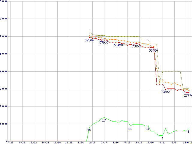 ※このグラフは過去のデータも税率5%相当に調整した税込み相当額のグラフです。 税率変更や、総額表示方式導入(2004年4月)の影響は除いています。 | | | ●凡例 | 最安値 (点線部は販売店未確認 または未調査) | 平均値 | 最高値 | ショップ数 |