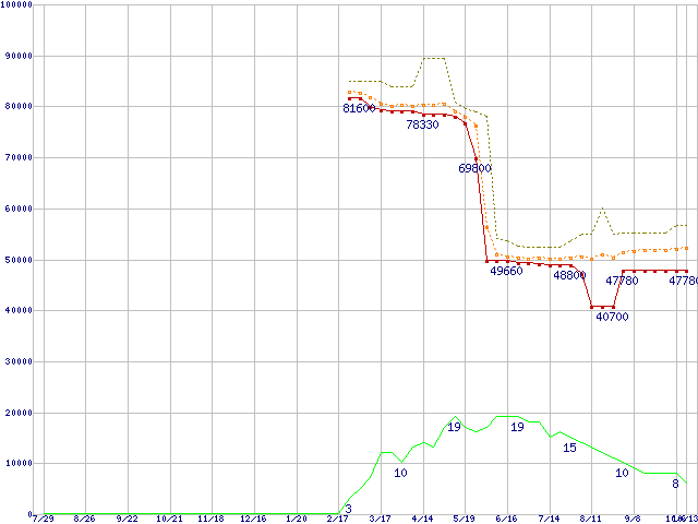 ※このグラフは過去のデータも税率5%相当に調整した税込み相当額のグラフです。 税率変更や、総額表示方式導入(2004年4月)の影響は除いています。 | | | ●凡例 | 最安値 (点線部は販売店未確認 または未調査) | 平均値 | 最高値 | ショップ数 |