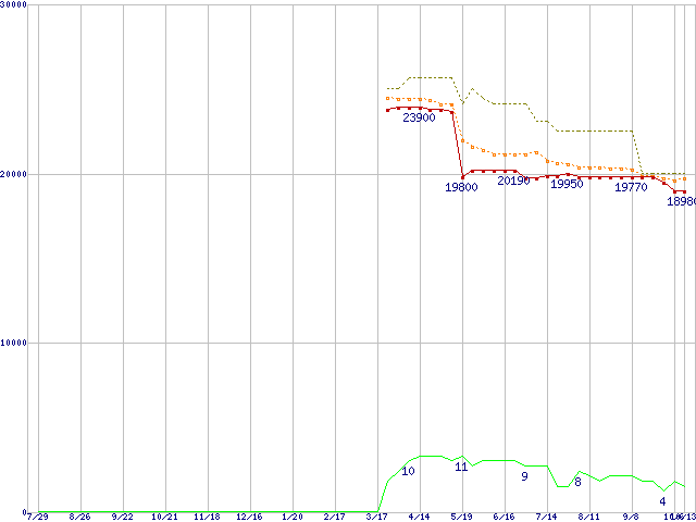 ※このグラフは過去のデータも税率5%相当に調整した税込み相当額のグラフです。 税率変更や、総額表示方式導入(2004年4月)の影響は除いています。 | | | ●凡例 | 最安値 (点線部は販売店未確認 または未調査) | 平均値 | 最高値 | ショップ数 |