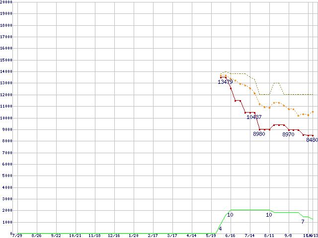 ※このグラフは過去のデータも税率5%相当に調整した税込み相当額のグラフです。 税率変更や、総額表示方式導入(2004年4月)の影響は除いています。 | | | ●凡例 | 最安値 (点線部は販売店未確認 または未調査) | 平均値 | 最高値 | ショップ数 |