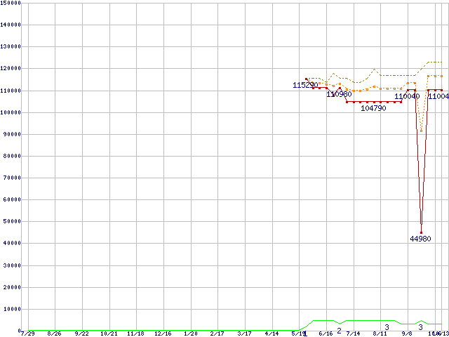 ※このグラフは過去のデータも税率5%相当に調整した税込み相当額のグラフです。 税率変更や、総額表示方式導入(2004年4月)の影響は除いています。 | | | ●凡例 | 最安値 (点線部は販売店未確認 または未調査) | 平均値 | 最高値 | ショップ数 |