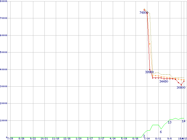 | Athlon 64 X2 4600+ (2.4GHz,L2 512KB×2,TDP65W)の価格推移 | | | (2005年7月29日~2006年10月13日) |