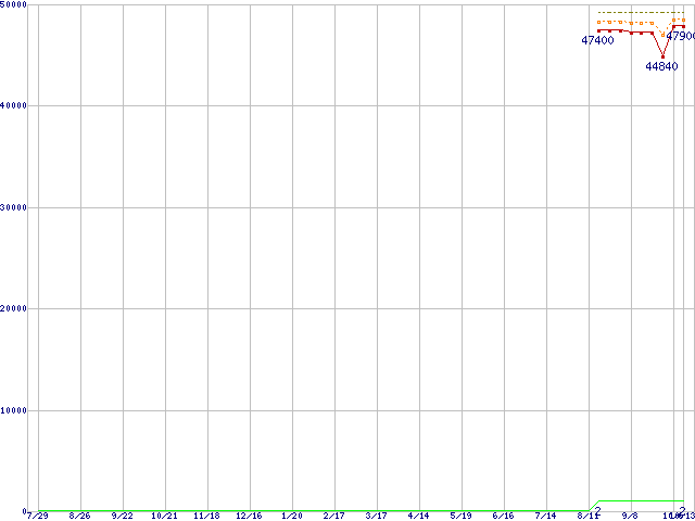 ※このグラフは過去のデータも税率5%相当に調整した税込み相当額のグラフです。 税率変更や、総額表示方式導入(2004年4月)の影響は除いています。 | | | ●凡例 | 最安値 (点線部は販売店未確認 または未調査) | 平均値 | 最高値 | ショップ数 |