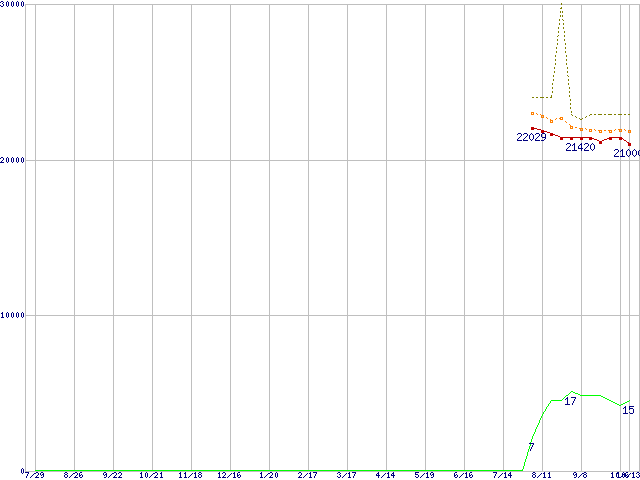 ※このグラフは過去のデータも税率5%相当に調整した税込み相当額のグラフです。 税率変更や、総額表示方式導入(2004年4月)の影響は除いています。 | | | ●凡例 | 最安値 (点線部は販売店未確認 または未調査) | 平均値 | 最高値 | ショップ数 |
