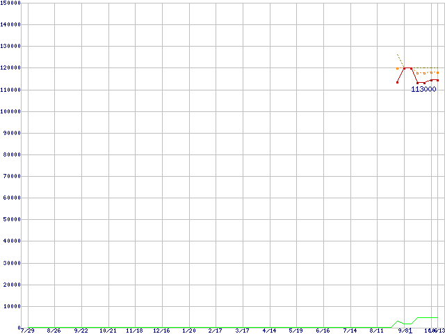 ※このグラフは過去のデータも税率5%相当に調整した税込み相当額のグラフです。 税率変更や、総額表示方式導入(2004年4月)の影響は除いています。 | | | ●凡例 | 最安値 (点線部は販売店未確認 または未調査) | 平均値 | 最高値 | ショップ数 |