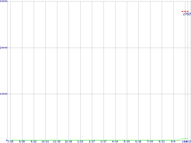 ※このグラフは過去のデータも税率5%相当に調整した税込み相当額のグラフです。 税率変更や、総額表示方式導入(2004年4月)の影響は除いています。 | | | ●凡例 | 最安値 (点線部は販売店未確認 または未調査) | 平均値 | 最高値 | ショップ数 |