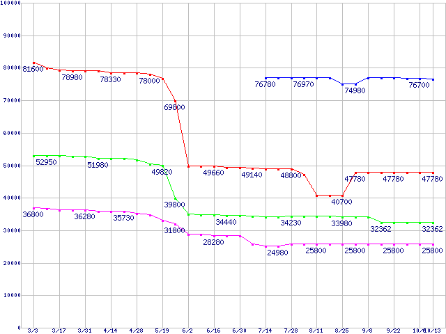 | Core Duo向けSocket 478 (FSB 667MHz,L2 2MB,Dual Core,VT対応)の最安値推移 | | | (2006年3月3日~2006年10月13日) |