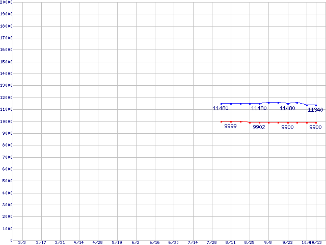 | LGA 775 (FSB 800MHz,L2 1MB,Hyper-Threading,EM64T対応)の最安値推移 | | | (2006年3月3日~2006年10月13日) |