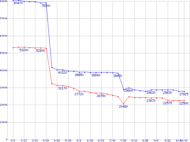 | LGA 775 (FSB 800MHz,L2 2MB×2,Dual Core,EM64T・VT対応)の最安値推移 | | | (2006年3月3日~2006年10月13日) |