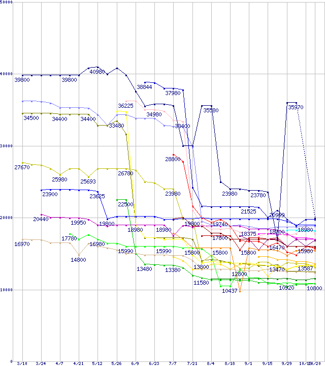 | CPU主要製品(最安値1万円~2万円未満)の最安値推移 | | | (2006年3月10日~2006年10月20日) |