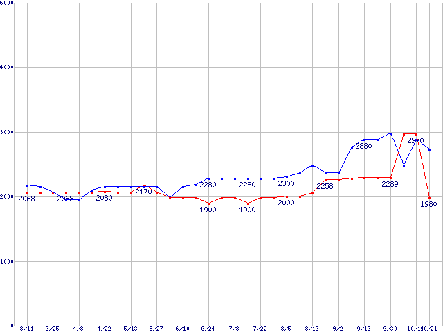 メモリ主要製品(最安値5千円未満)の最安値推移