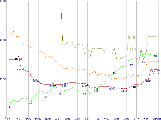 ※このグラフは過去のデータも税率5%相当に調整した税込み相当額のグラフです。 税率変更や、総額表示方式導入(2004年4月)の影響は除いています。 | | | ●凡例 | 最安値 (点線部は販売店未確認 または未調査) | 平均値 | 最高値 | ショップ数 |