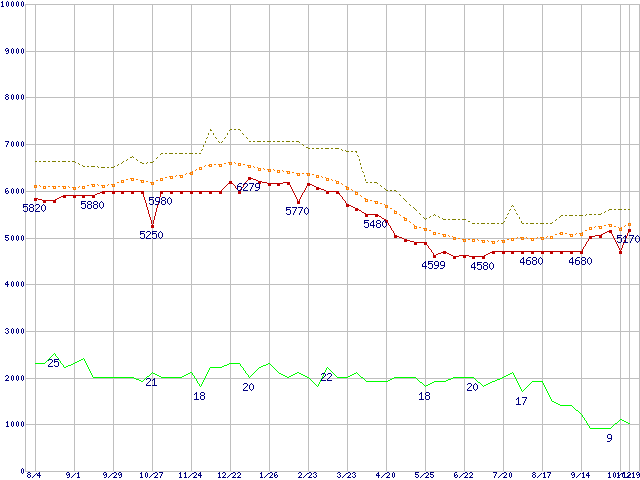 ※このグラフは過去のデータも税率5%相当に調整した税込み相当額のグラフです。 税率変更や、総額表示方式導入(2004年4月)の影響は除いています。 | | | ●凡例 | 最安値 (点線部は販売店未確認 または未調査) | 平均値 | 最高値 | ショップ数 |