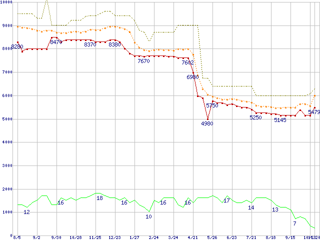 ※このグラフは過去のデータも税率5%相当に調整した税込み相当額のグラフです。 税率変更や、総額表示方式導入(2004年4月)の影響は除いています。 | | | ●凡例 | 最安値 (点線部は販売店未確認 または未調査) | 平均値 | 最高値 | ショップ数 |