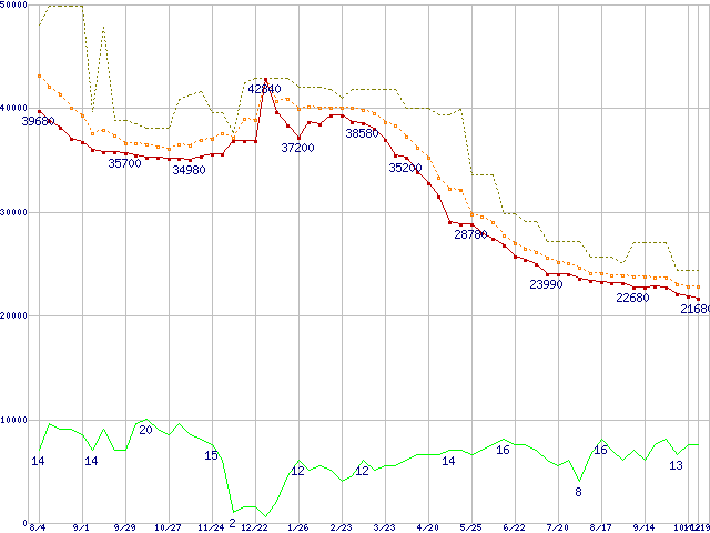 ※このグラフは過去のデータも税率5%相当に調整した税込み相当額のグラフです。 税率変更や、総額表示方式導入(2004年4月)の影響は除いています。 | | | ●凡例 | 最安値 (点線部は販売店未確認 または未調査) | 平均値 | 最高値 | ショップ数 |