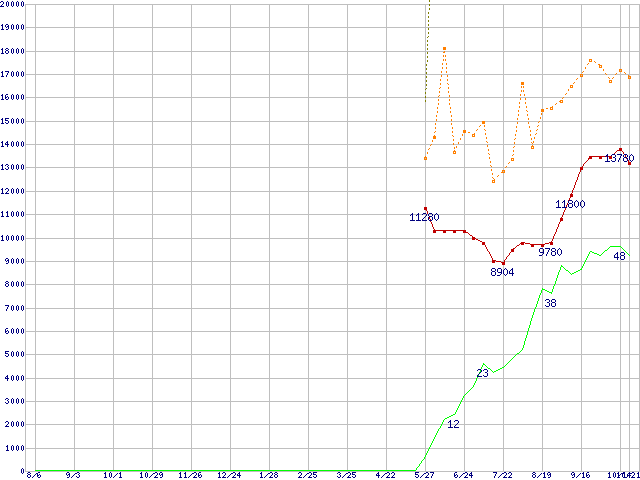 ※このグラフは過去のデータも税率5%相当に調整した税込み相当額のグラフです。 税率変更や、総額表示方式導入(2004年4月)の影響は除いています。 | | | ●凡例 | 最安値 (点線部は販売店未確認 または未調査) | 平均値 | 最高値 | ショップ数 |