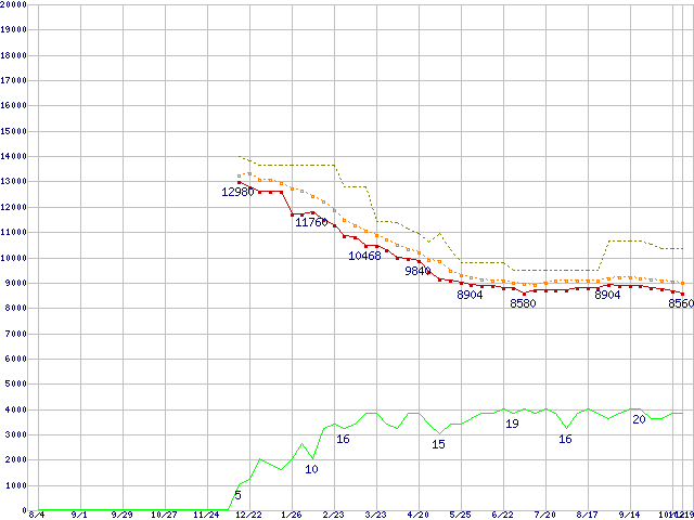 ※このグラフは過去のデータも税率5%相当に調整した税込み相当額のグラフです。 税率変更や、総額表示方式導入(2004年4月)の影響は除いています。 | | | ●凡例 | 最安値 (点線部は販売店未確認 または未調査) | 平均値 | 最高値 | ショップ数 |