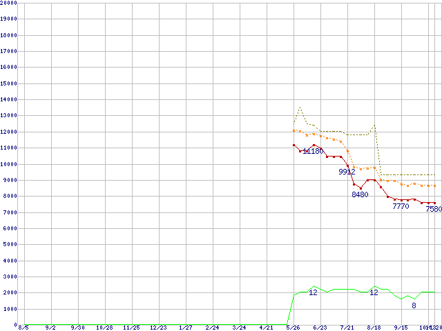 | Sempron 3400+ (1.8GHz,L2 256KB)の価格推移 | | | (2005年8月5日~2006年10月20日) |