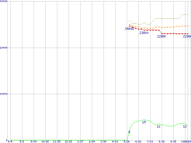 ※このグラフは過去のデータも税率5%相当に調整した税込み相当額のグラフです。 税率変更や、総額表示方式導入(2004年4月)の影響は除いています。 | | | ●凡例 | 最安値 (点線部は販売店未確認 または未調査) | 平均値 | 最高値 | ショップ数 |
