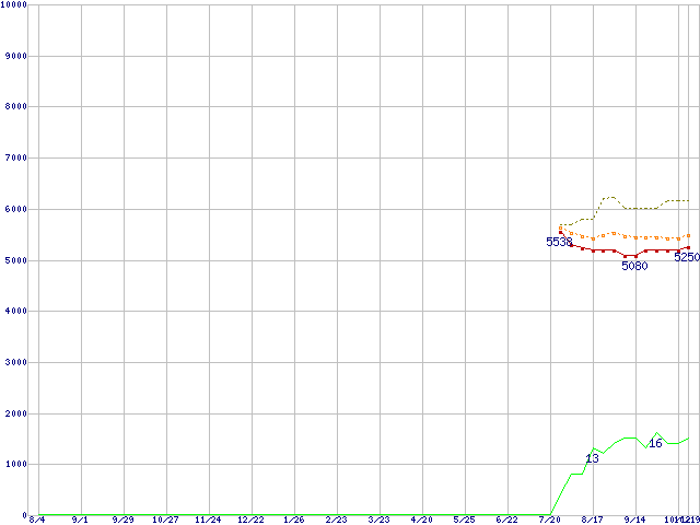 ※このグラフは過去のデータも税率5%相当に調整した税込み相当額のグラフです。 税率変更や、総額表示方式導入(2004年4月)の影響は除いています。 | | | ●凡例 | 最安値 (点線部は販売店未確認 または未調査) | 平均値 | 最高値 | ショップ数 |