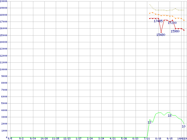 ※このグラフは過去のデータも税率5%相当に調整した税込み相当額のグラフです。 税率変更や、総額表示方式導入(2004年4月)の影響は除いています。 | | | ●凡例 | 最安値 (点線部は販売店未確認 または未調査) | 平均値 | 最高値 | ショップ数 |