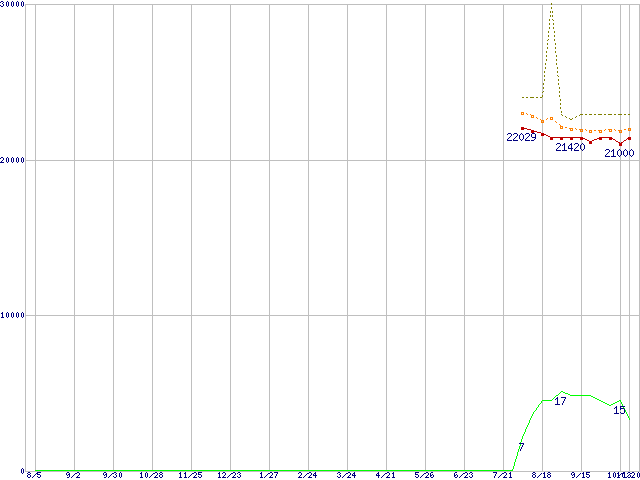 ※このグラフは過去のデータも税率5%相当に調整した税込み相当額のグラフです。 税率変更や、総額表示方式導入(2004年4月)の影響は除いています。 | | | ●凡例 | 最安値 (点線部は販売店未確認 または未調査) | 平均値 | 最高値 | ショップ数 |