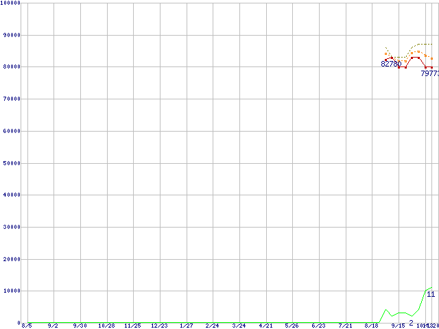 ※このグラフは過去のデータも税率5%相当に調整した税込み相当額のグラフです。 税率変更や、総額表示方式導入(2004年4月)の影響は除いています。 | | | ●凡例 | 最安値 (点線部は販売店未確認 または未調査) | 平均値 | 最高値 | ショップ数 |