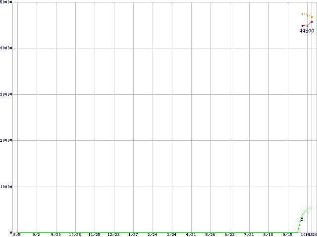 ※このグラフは過去のデータも税率5%相当に調整した税込み相当額のグラフです。 税率変更や、総額表示方式導入(2004年4月)の影響は除いています。 | | | ●凡例 | 最安値 (点線部は販売店未確認 または未調査) | 平均値 | 最高値 | ショップ数 |