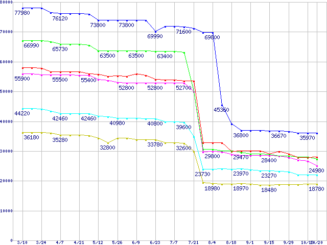 | Socket 939 (FSB 1000MHz,Dual Core)の最安値推移 | | | (2006年3月10日~2006年10月20日) |