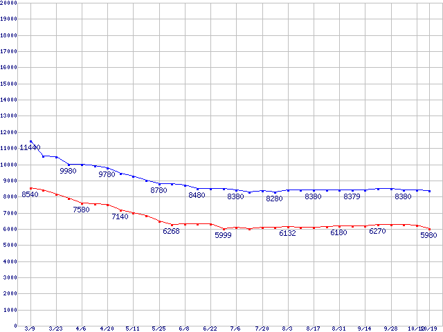 | Deskstar T7K250 (7200rpm,Serial ATA II/3Gbps)の最安値推移 | | | (2006年3月9日~2006年10月19日) |