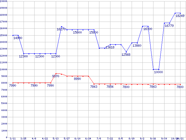 | PC3200(DDR400) DDR SDRAM DIMM ECC対応 Registeredタイプの最安値推移 | | | (2006年3月11日~2006年10月21日) |