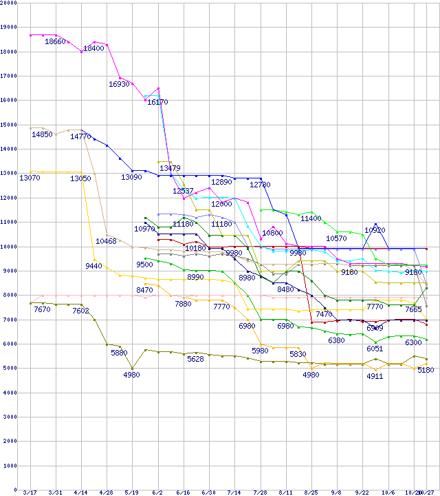 | CPU主要製品(最安値1万円未満)の最安値推移 | | | (2006年3月17日~2006年10月27日) |