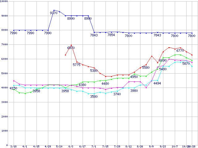 メモリ主要製品(最安値5千円~1万円未満)の最安値推移