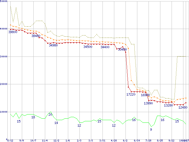 | Athlon 64 3800+ (2.4GHz,L2 512KB,Socket 939)の価格推移 | | | (2005年8月12日~2006年10月27日) |